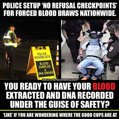 Now your friendly neighborhood roadblock gets a roadside judge, with a packets of instant warrants, fill in the name and stamp and implied consent is suddenly for giving a blood, sample upon demand. So with your friendly neighborhood roadblock you get a nurse, later they will be replaced with EMTs or specially trained officers, but eventually it will be minimum wage trained monkeys drawing your blood. Later they will decided that a Judge isn't necessary and just have an officer of the court to stamp out warrants...So this is our new world freedom, just be driving down the road minding your own business and you have to roll up your sleeve, and give blood in order to drive across town. Forget about drinking it's illegal.